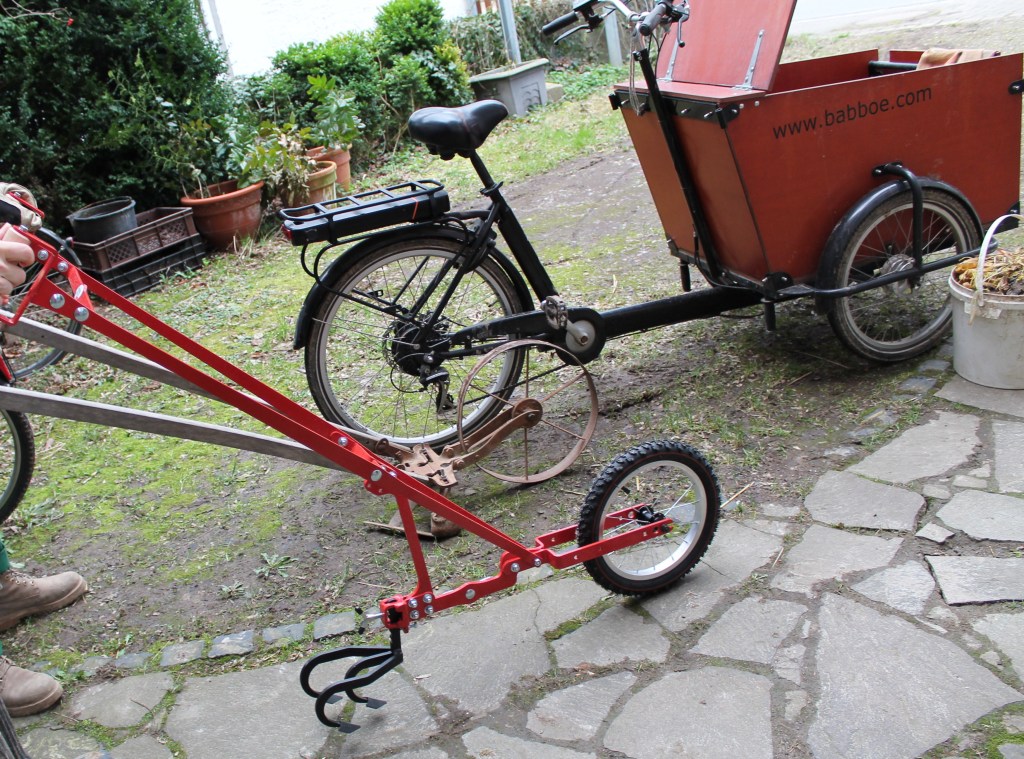 Werkzeuge: neue Radhacke, alte Radhacke und Lastenfahrrad